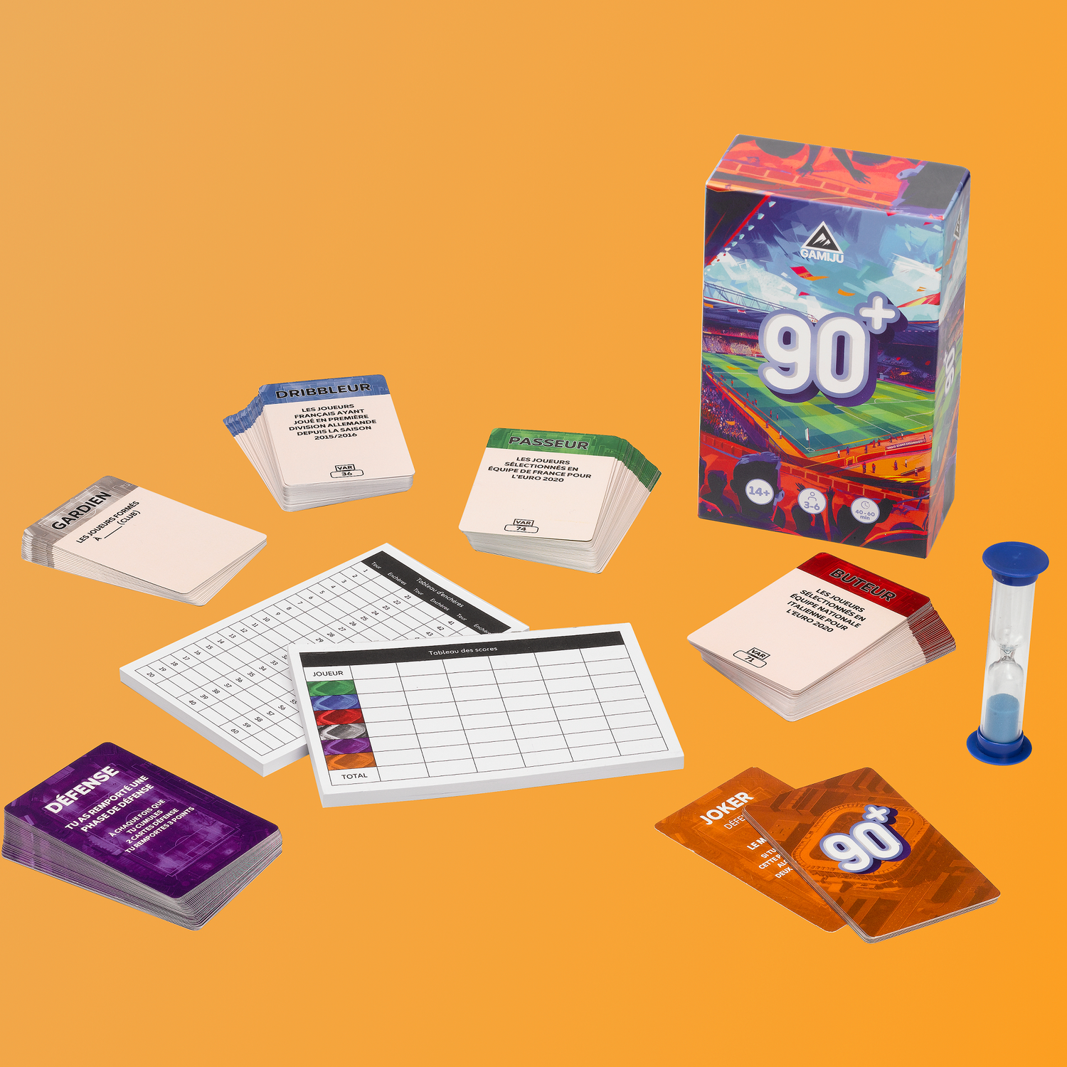 Ressentez l'adrénaline de chaque match ! 90+ est un jeu de société inspiré des moments de partage autour du football. Facile à comprendre, il offre des parties passionnantes, pleines de nostalgie, parfaites pour les fans de foot et les amateurs de jeux de cartes.